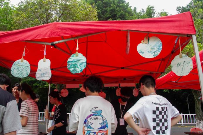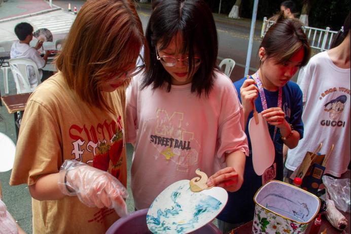 活动摊位前人头攒动,同学们纷纷驻足参与,体验着自我创作的乐趣。同学们首先挑选自己心仪的扇面,然后发挥无限的创意,将喜欢的颜色油漆混合倒入水中,再将扇面缓缓浸入色彩斑斓的水中,平凡的扇面转瞬便成为了一件件充满创意和个性的艺术品,通过亲手制作独一无二的扇子,同学们不仅展示了自己的创造力和审美,还体验了从创作到成品的喜悦与成就感。这不仅是一次简单的手工体验,更是对青春创意与个性的张扬,是对学校“阳光雨露计划”理念的生动诠释。